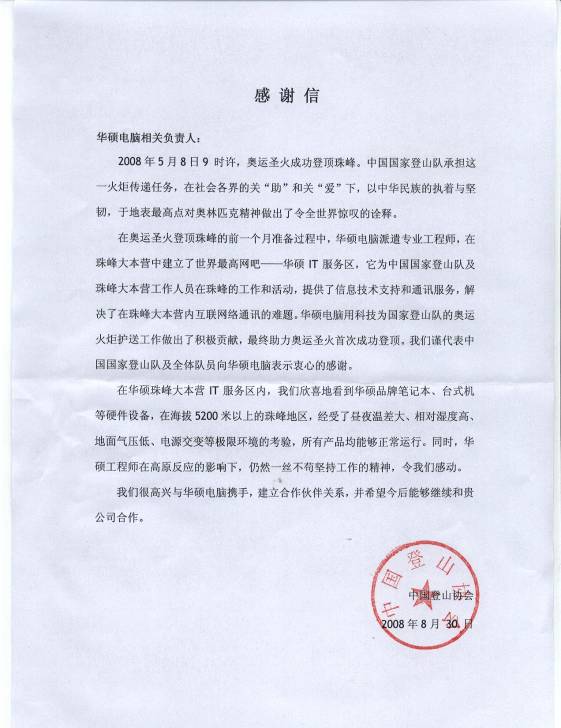 華碩助力國(guó)家登山隊(duì)圣火登頂成功 2008年5月8日9 時(shí)許,奧運(yùn)圣火成功登頂珠峰。承擔(dān)這一火炬?zhèn)鬟f任務(wù)的中國(guó)登山隊(duì),于地表最高點(diǎn)上對(duì)奧林匹克精神做出了令全世界驚嘆的詮釋。與此同時(shí),在珠峰大本營(yíng)的華碩中國(guó)登山隊(duì)IT服務(wù)區(qū)中,國(guó)家登山隊(duì)的戰(zhàn)略合作伙伴華碩,也第一時(shí)間分享了圣火英雄們的激動(dòng)喜悅,為自身兩年來(lái)支持國(guó)家登山隊(duì)的圣火登頂之旅劃上了圓滿句號(hào)。