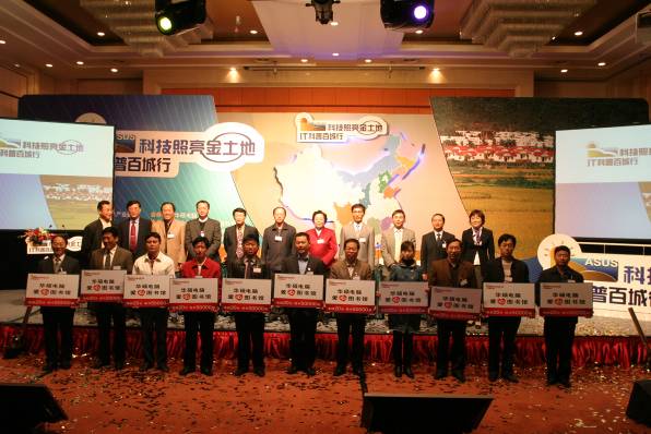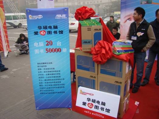 科技照亮金土地,IT科普百城行 2007年10月,由中華人民共和國信息產(chǎn)業(yè)部、中國科學技術協(xié)會聯(lián)合華碩電腦舉辦的“科技照亮金土地 IT科普百城行”活動在京正式啟動;顒有问綖樵谌珖100個二、三、四級城市開展信息化科學技術普及工作。信息產(chǎn)業(yè)部副部長茍仲文、科協(xié)榮譽主席江澤慧出席了活動并作了精彩的致辭,中國科協(xié)科普部副部長高勘、信產(chǎn)部電子情報研究所所長石懷成,以及來自黑龍江、吉林、遼寧、內(nèi)蒙古、河北、山東、陜西、湖南、江西、四川等十省、自治區(qū)的代表共同參加了此次活動。截至2008年底,華碩在全國116個地區(qū)建立“華碩愛心圖書館”,為每個地區(qū)捐贈5000冊圖書和管理圖書用的電腦兩套,舉辦IT科學技術普及活動、組織愛心捐贈和開展技術講座和培訓。