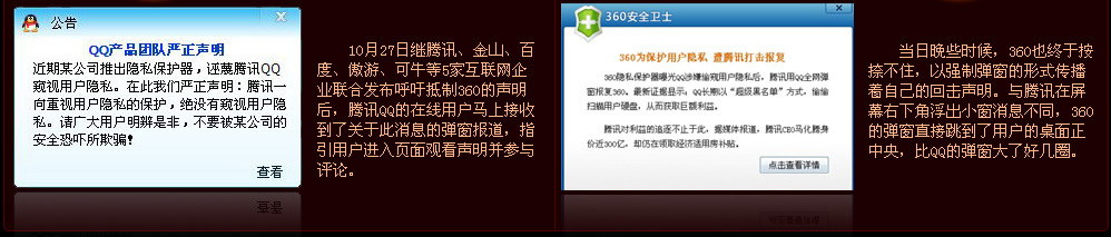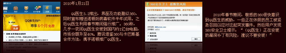 360公司創(chuàng)立于2005年,于2006年7月推出主打互聯(lián)網(wǎng)安全的“360安全衛(wèi)士”軟件,不到一年即成為國內(nèi)最大的安全軟件。據(jù)官方數(shù)據(jù),其用戶數(shù)量已經(jīng)超過3億,覆蓋了75%以上的中國互聯(lián)網(wǎng)用戶,成為國內(nèi)第二大桌面客戶端軟件。以該客戶端為基礎(chǔ),360延伸出免費殺毒軟件、瀏覽器等產(chǎn)品,均獲得了成功。旗下產(chǎn)品有360安全衛(wèi)士、360殺毒、360安全瀏覽器、360保險箱、360手機衛(wèi)士等產(chǎn)品。 |