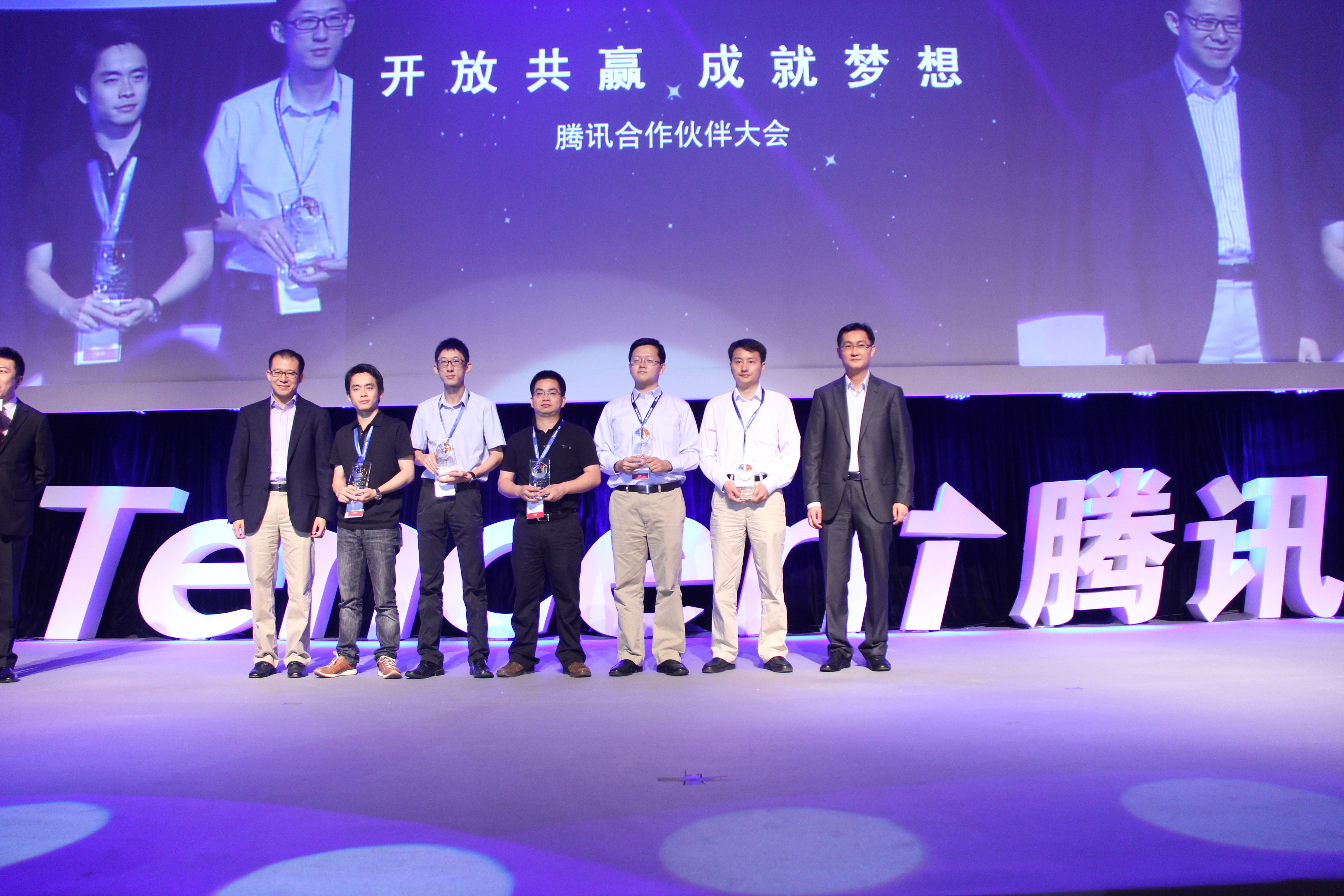 騰訊向開放平臺優(yōu)秀合作伙伴頒獎(左一)騰訊總裁劉熾平、(右一)騰訊董事會主席兼首席執(zhí)行官馬化騰