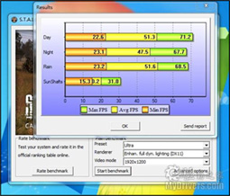 作為首款DX11測(cè)試程序,《Heaven》支持眾多DX11特效,尤其是Tessellation曲面細(xì)分技術(shù)。實(shí)測(cè)中不開曲面細(xì)分選項(xiàng)的話,HD 5770的性能表現(xiàn)尚可,而開啟Tessellation后畫面更為細(xì)膩,但是幀數(shù)也隨之下降,1680x1024開4AA的情況下已經(jīng)沒有什么可玩性,畢竟HD 5770是目前入門級(jí)的DX11顯卡。