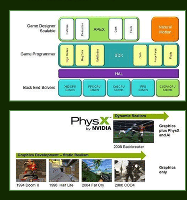 事實(shí)上在PhysX設(shè)計(jì)之初,它是只支持CPU和PPU物理加速的,不過在被收購(gòu)之后,NVIDIA通過CUDA架構(gòu)將其重新編譯,并打包進(jìn)NVIDIA的驅(qū)動(dòng)程序中進(jìn)行發(fā)布。盡管NVIDIA表示今后將大力發(fā)展GPU物理加速,但這并不表示PhysX引擎排斥CPU或者CPU+GPU的綜合解決方案。