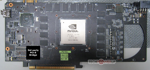 不過與GTX 295使用橋接芯片nForce 200的內(nèi)部SLI不同,華碩安裝了一顆第三方芯片,雖然沒有披露具體型號和制造商,但估計就是PLX和IDT兩家其中之一,因為目前為止也只有這兩家有實力提供這種橋接芯片。